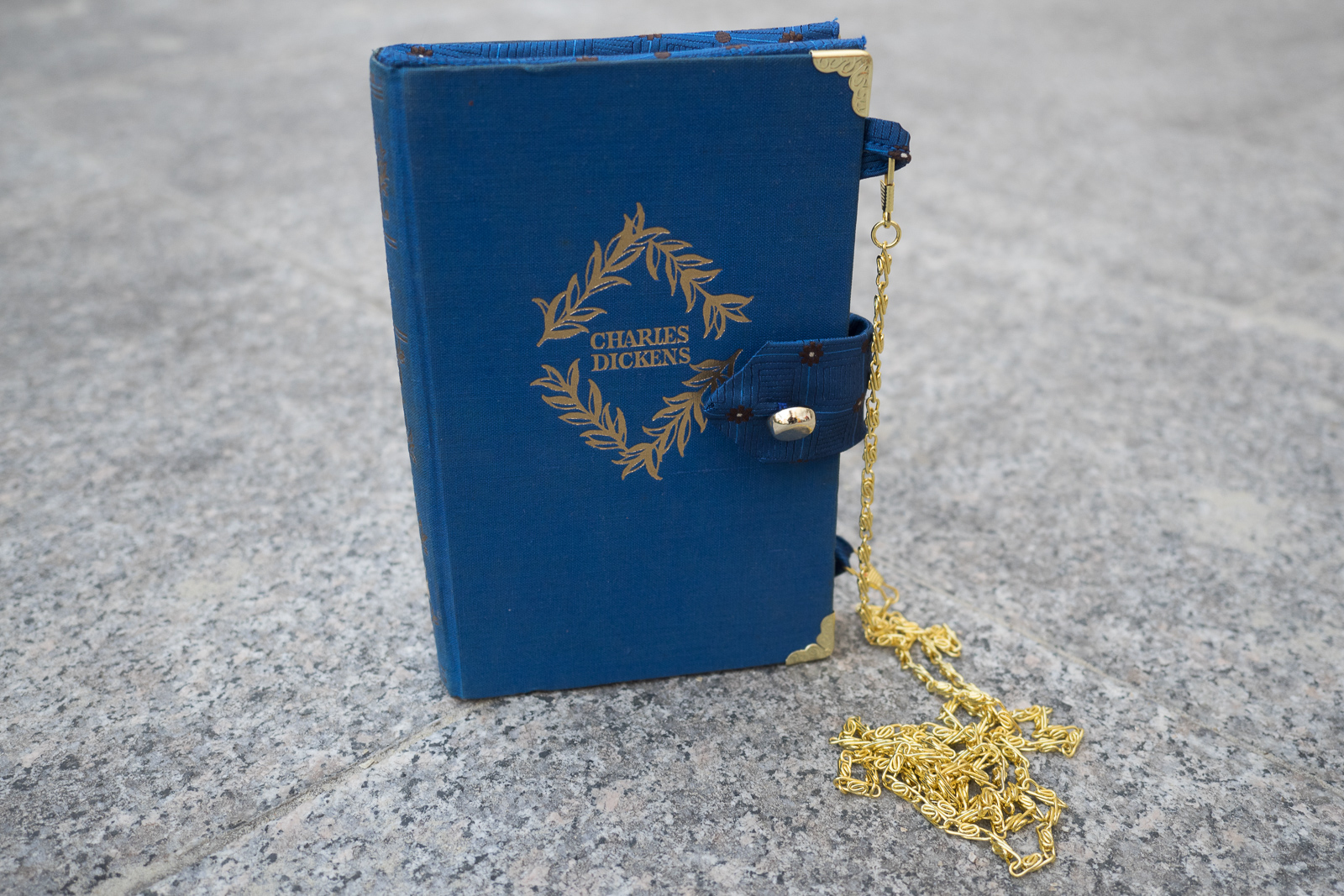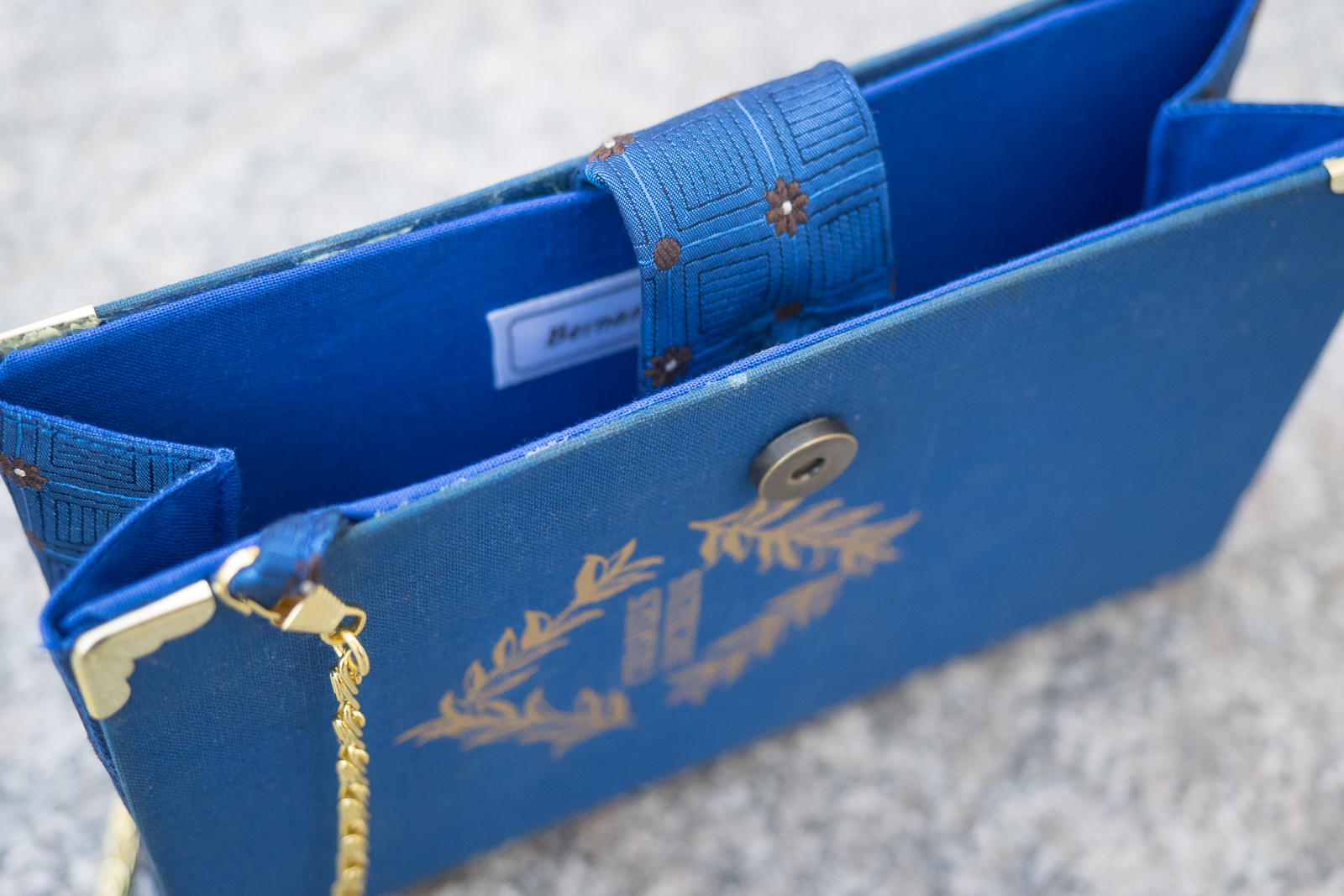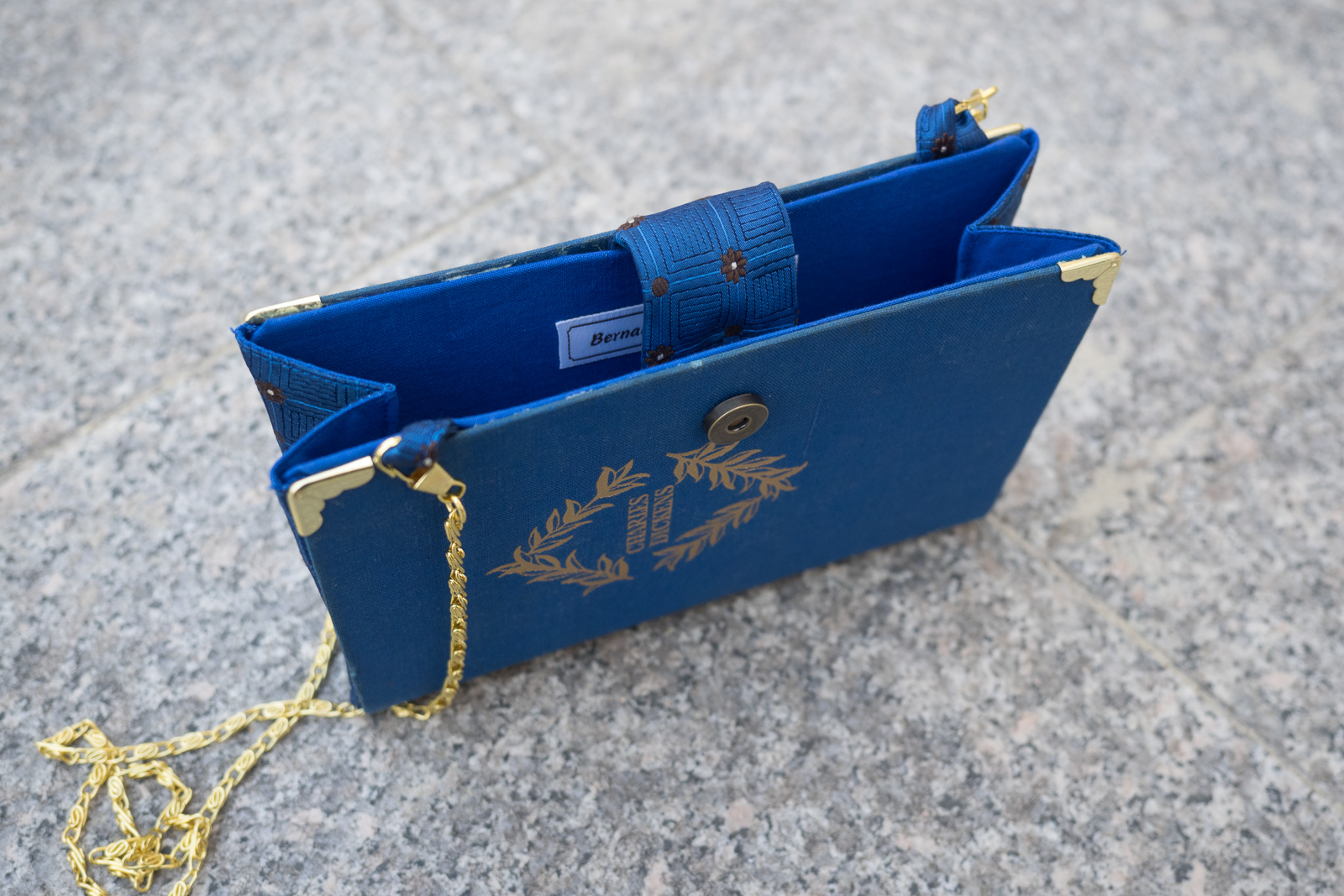 Schönes Blitzblau mit Goldprägung, kombiniert mit einem goldenen Metalltaschenriemen. Ideal für Bälle oder Theaterabende.